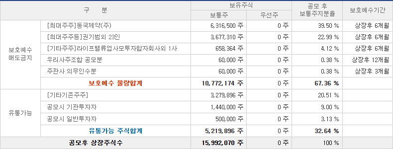 보호예수 물량은 67.36%, 상장 당일 유통가능 물량은 32.64%입니다.