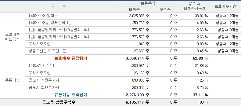 - 상장 당일 유통 가능 물량은 37.11%, 상장 3개월 후 최대 25.32%의 물량이 추가로 풀릴 수 있다.